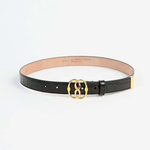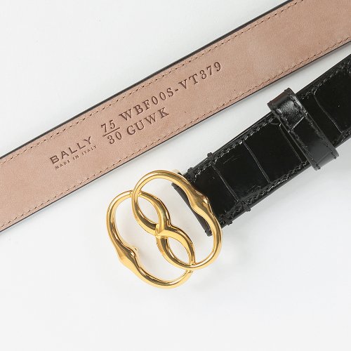 Ремень от бренда BALLY выполнен из натуральной кожи с тиснением под крокодила и глянцевым блеском. Аксессуар дополнен золотистой металлической пряжкой. Ширина изделия оптимальна для классических брюк и юбок.