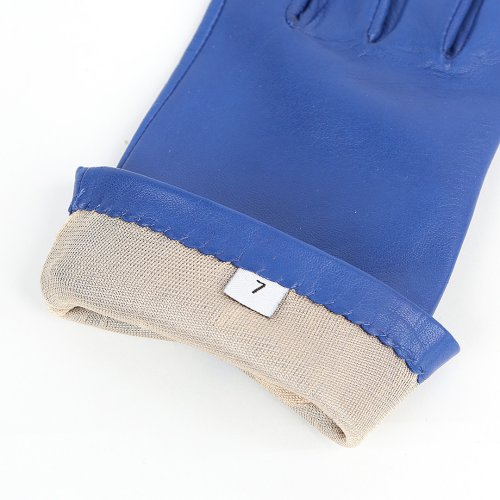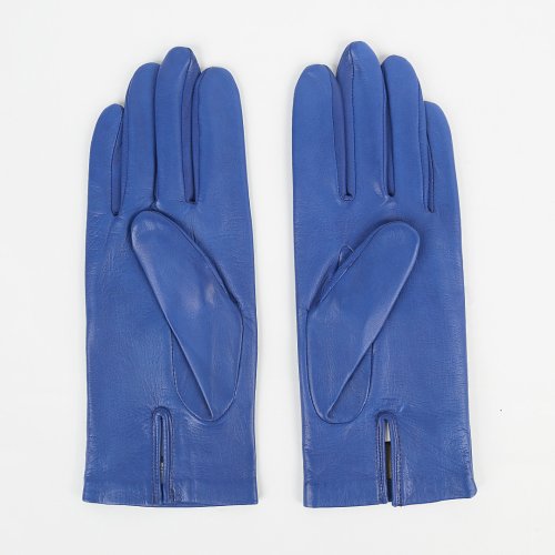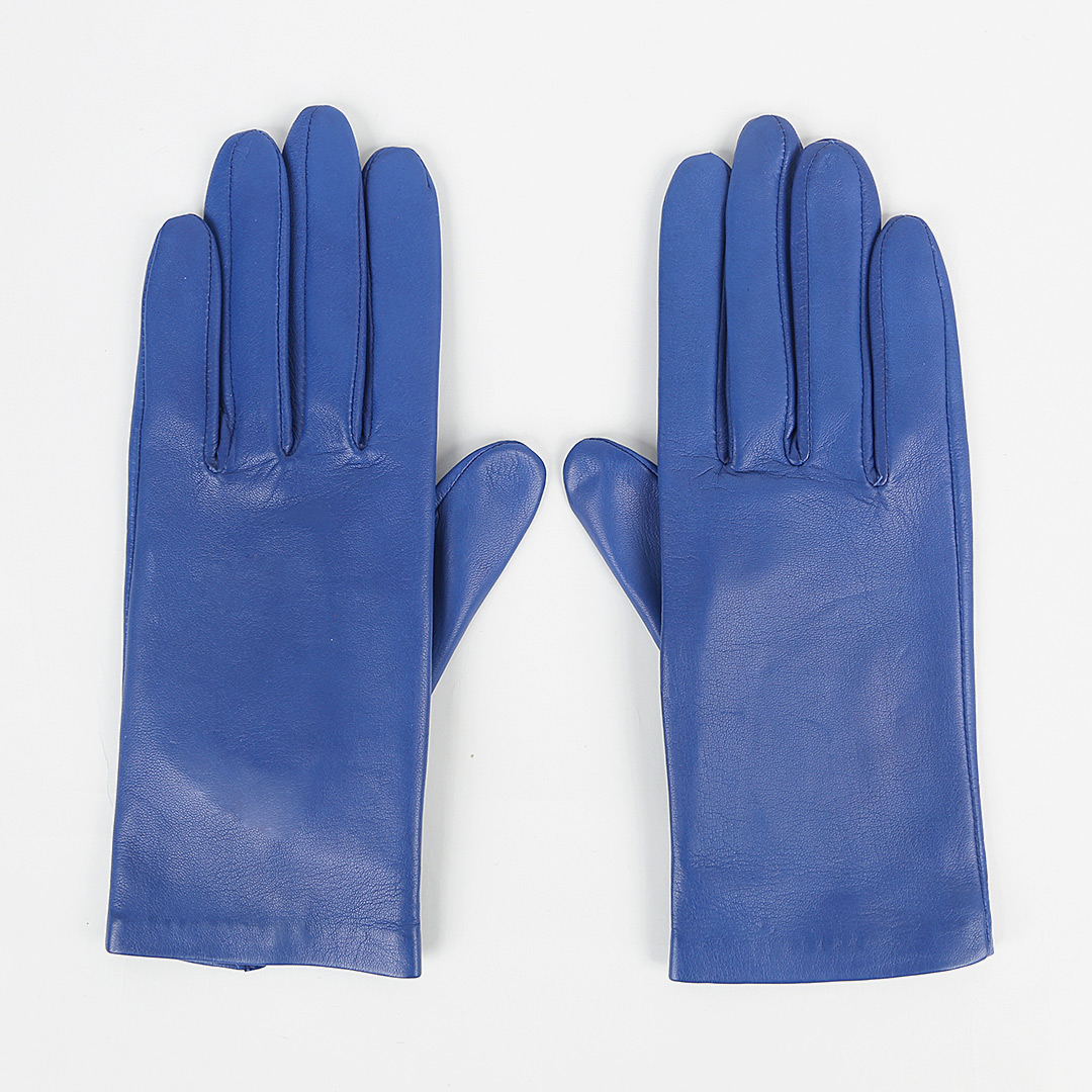 Синие перчатки от французского бренда AGNELLE с шелковым подкладом выполнили из наппы. Материал обладает эластичными и износостойкими свойствами. Манжету дополнили аккуратным разрезом.