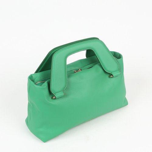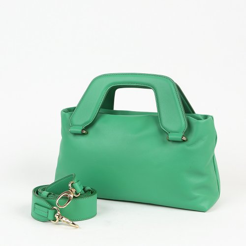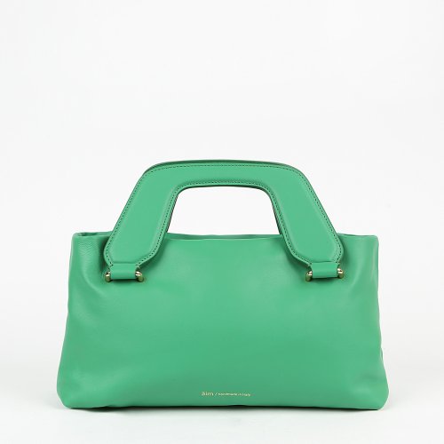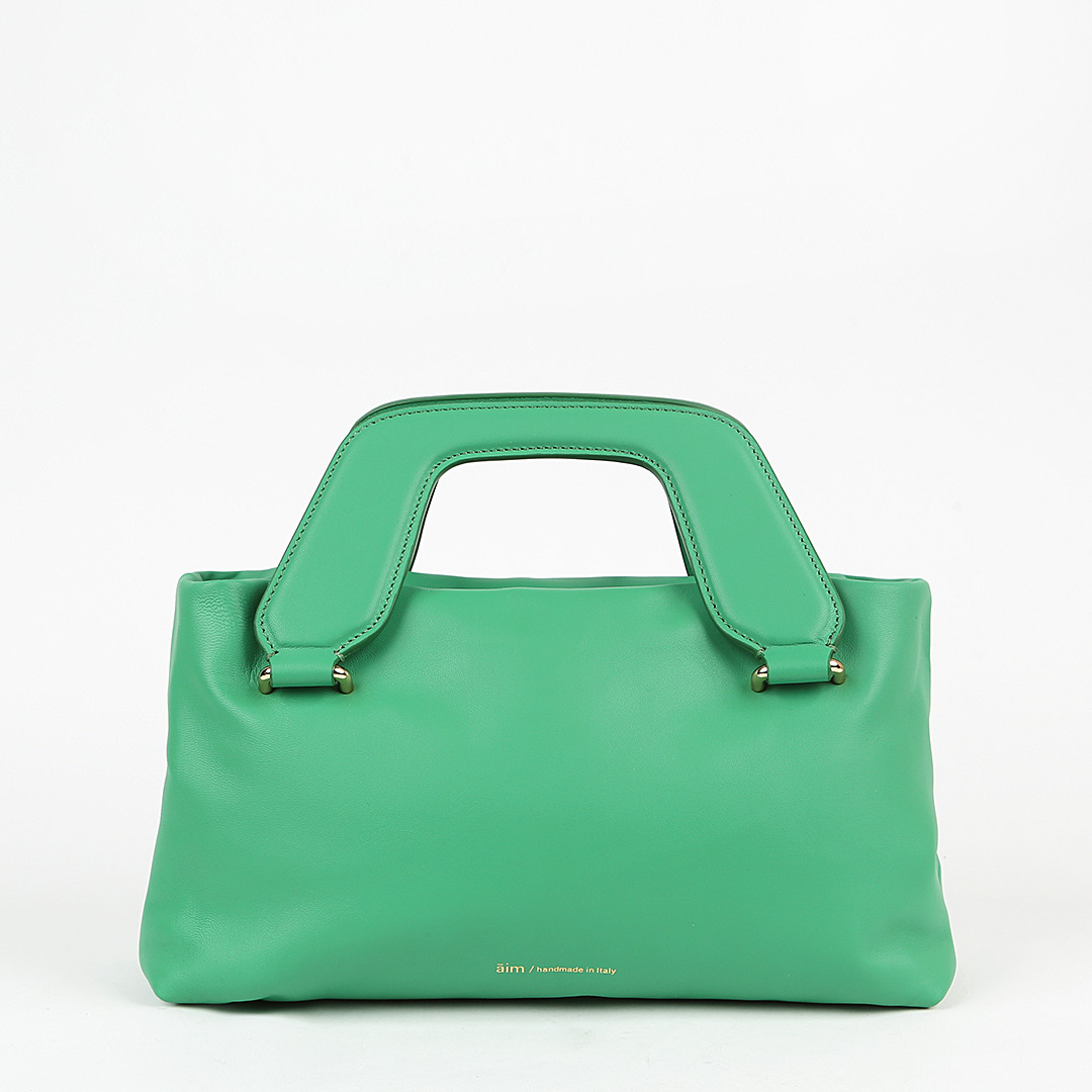 Сумка NANO от бренда AIM/HANDMADE IN ITALY изготовлена вручную из натуральной мягкой кожи изумрудного оттенка. Модель имеет две короткие ручки фирменной формы и съемный плечевой ремень. Внутри мастера марки добавили карман на молнии.