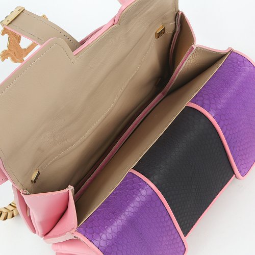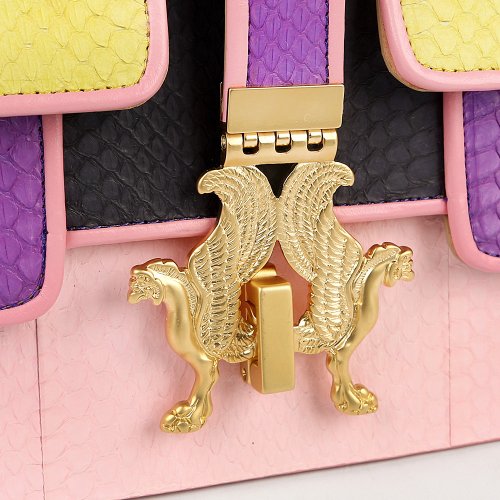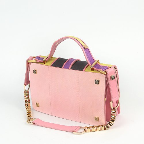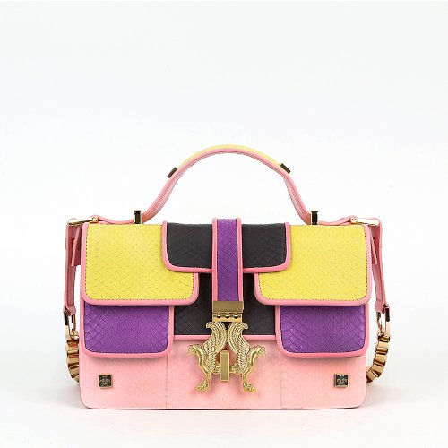 Сумка MULTI от итальянского бренда GIANCARLO PETRIGLIA отличается строгой конструкцией и выразительным цветовым решением. Комбинация желтого, сиреневого, чёрного и розового дополнена золотистой застежкой с декоративными элементами в виде двух грифонов. Верхняя ручка и съёмный ремень с цепочкой позволяют носить сумку двумя способами.