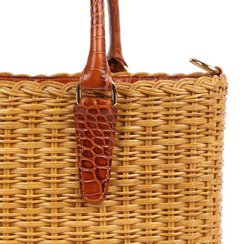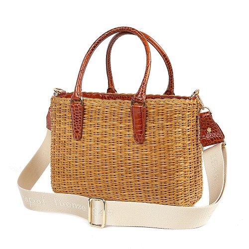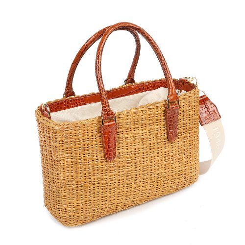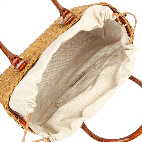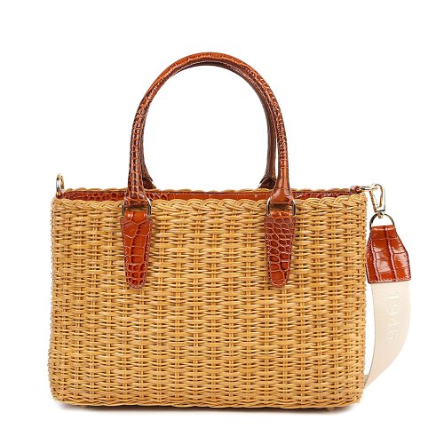 Сумка от итальянского бренда CAPAF выполнена с акцентом на практичность, но не лишена декоративной выразительности. Плетение из натуральной лозы дополнено коричневыми кожаными ручками с тиснением под крокодила. В комплекте – регулирующийся плечевой ремень.