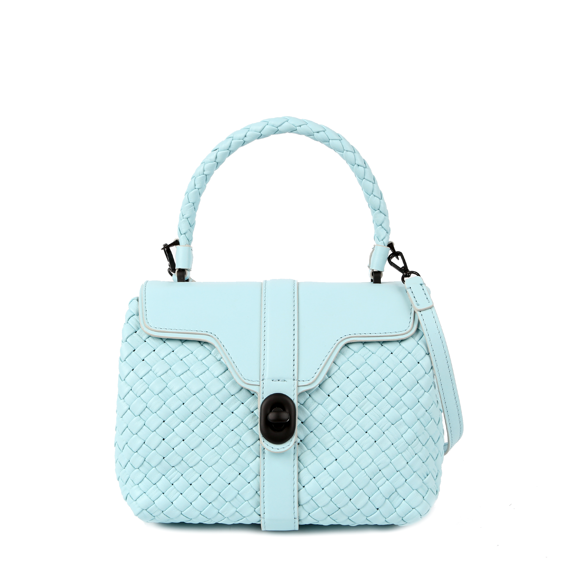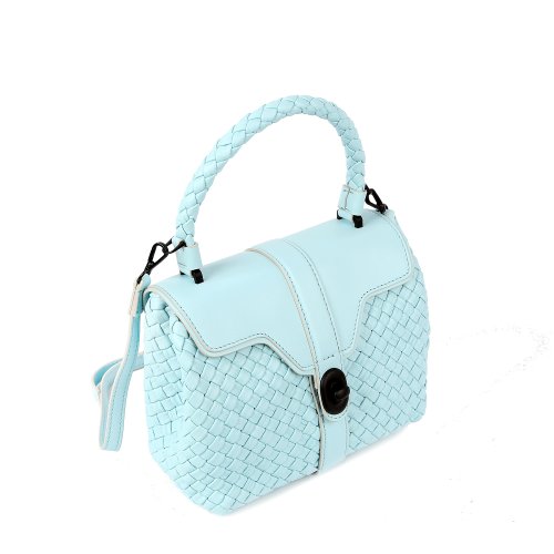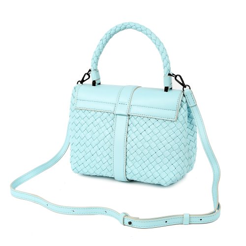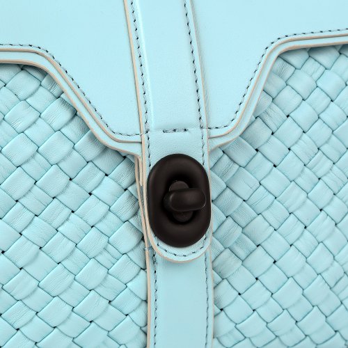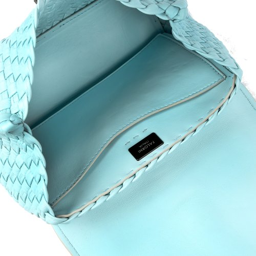 Сумка в голубом оттенке от итальянского бренда FALORNI гармонично сочетается с деловыми костюмами и летними платьями. Для изготовления модели использовали натуральную плетеную кожу. Ручка изделия выполнена в том же плетеном стиле, что и корпус. В комплекте – съемный ремень.