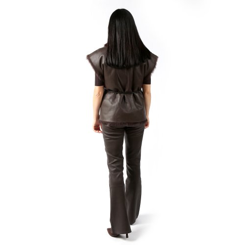 Элегантный двухсторонний жилет из овчины в насыщенном тёмно-коричневом оттенке — универсальная модель, которую можно носить сразу в двух вариантах. Мягкий, густой ворс создаёт выразительную фактуру и ощущение премиального комфорта, а обратная сторона предлагает более лаконичный и спокойный вид, что делает жилет идеальным для разных стилей и поводов.