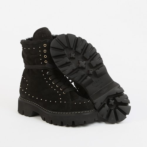 Черные замшевые ботинки SOFTY от JUDARI – незаменимая пара обуви в холодные времена. Дизайнеры украсили модель минималистичными стразами, напоминающими звезды в космическом пространстве. За комфорт при ходьбе отвечают натуральные материалы и скульптурная подошва с неглубоким протектором.