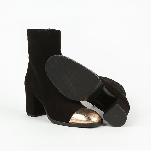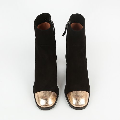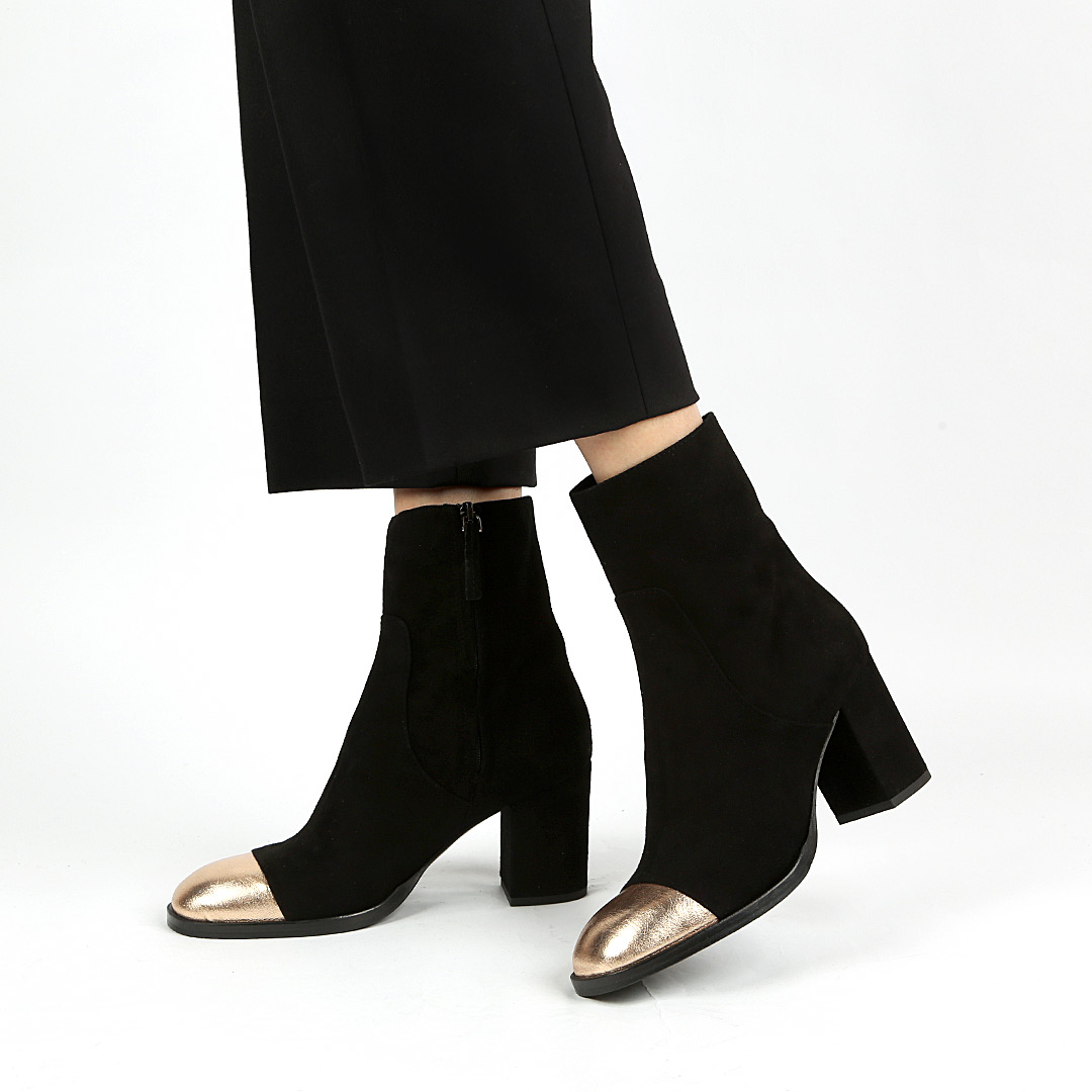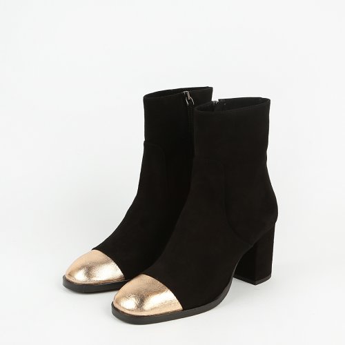 В полусапогах от итальянского бренда JUBILE легко почувствовать себя на высоте. Изюминкой пары стал носок из металлизированной кожи золотистого оттенка. Устойчивый каблук и натуральная замша делают модель не только эффектной, но и удобной.